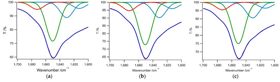 FTIR spectra (purple curves) in the amide I region obtained from the (a–c) 1–3/[Au(CN)2]−, (d–f) 1–3/[Ag(CN)2]−, and (g–i) 1–3/[Pt(CN)4]2− hybrids, where [Au(CN)2]− = 3.5 mM, [Ag(CN)2]− = 5.0 mM, and [Pt(CN)4]2− = 2.7 mM. Multiple Gaussian fitting was used to determine the secondary structural components. Blue, green, red, and orange curves denote the amide I features related to β-sheet (1610–1640 cm−1), random coil (1640–1660 cm−1, including PII structures), 310-helix or β-turn-like (1660–1685 cm−1), and antiparallel β-sheet structures (1675–1690 cm−1), respectively [72,73,74,75,76]. The overall curve fittings are indicated by the red lines.