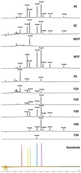 The components of EE, AE, MTF and MCP are shown in Figure 1. The components were identified by comparison with authentic samples of the individual compounds. EE, AE and MTF mainly contained caffeic acid, quercetin 3-O-galactoside, isoquercetin, astragalin, rosmarinic acid, aromadendrin-3-O-rutinoside, rosmarinic acid-3-O-glucoside and kaempferol-7-O-glucoside. After enrichment, the peak areas of various components of MTF increased. MCP contained isoquercetin. F0 contained caffeic acid, quercetin 3-O-galactoside and rosmarinic acid. F10 contained caffeic acid, quercetin 3-O-galactoside, isoquercetin, astragalin and rosmarinic acid. F20 mainly contained quercetin 3-O-galactoside, isoquercetin, astragalin and rosmarinic acid. F30 mainly contained quercetin 3-O-galactoside, isoquercetin, astragalin, rosmarinic acid, aromadendrin-3-O-rutinoside and rosmarinic acid-3-O-glucoside. F40 contained isoquercetin, astragalin, rosmarinic acid, aromadendrin-3-O-rutinoside, rosmarinic acid-3-O-glucoside and kaempferol-7-O-glucoside. F50 contained only astragalin.