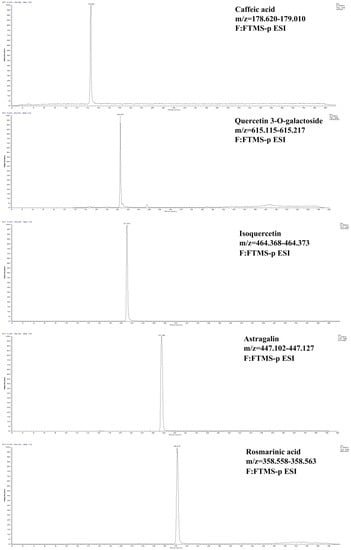 The ion chromatogram of caffeic acid, quercetin 3-O-galactoside, isoquercetin, astragalin and rosmarinic acid are shown in Figure 2. Based on fragment ions and previous reports in the literature [,,], Peak 6, Peak 7 and Peak 8 were tentatively deduced as aromadendrin-3-O-rutinoside, rosmarinic acid-3-O-glucoside and kaempferol-7-O-glucoside, respectively (Table 2).