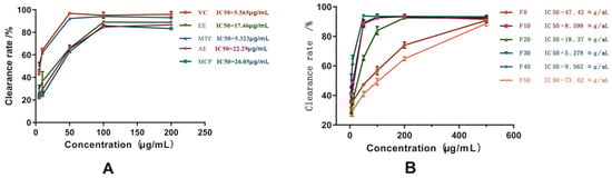 As shown in Figure 3, the DPPH radical scavenging abilities of different extracts of MCB were determined and compared as follows: MTF > EE > AE > MCP and F30 > F10 > F40 > F20 > F0 > F50 (Figure 3). In addition, the DPPH radical scavenging ability of total flavonoids (IC50 = 5.323 µg/mL) and 30% ethanol eluent (IC50 = 5.278 µg/mL) was similar to Vitamin C (VC) (IC50 = 5.565 µg/mL). The antiradical activity test and the FRAP assay evaluated the antioxidant properties of MCB extracts (Figure 4). The antioxidant activity of AE was lower than EE. The antioxidant activity of MTF improved after enrichment and purification, but not with MCP. In addition, the results of the two antioxidant tests were consistent: MTF > F30 > F10 > F40 > F20. Among the extracts with antioxidant effects, the content of flavonoids was higher, and the content of polysaccharides was relatively low.