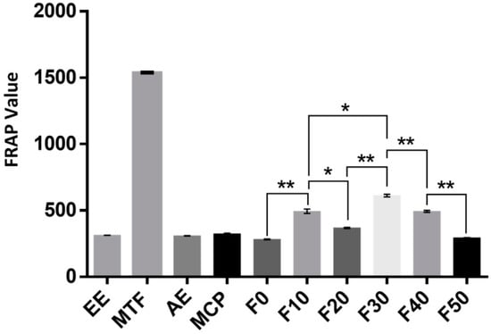 Results of the FRAP method. The in vitro antioxidant activity of MCB is expressed by FRAP values, followed by F30, F10, F40 and F20. EE: alcohol extract, AE: aqueous extract, MTF: total flavonoids, MCP: crude polysaccharides. “*” and “**” mean p < 0.01 and p < 0.05, respectively. Data are expressed as mean ± standard deviation (n = 5).
