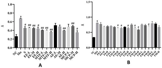 The absorbance of EE and MTF at low, moderate and high doses was lower than in the model group (p < 0.05). The absorbance of AE at high doses and the absorbance of MCP at moderate and high doses were lower than in the model group (p < 0.05). In the macroporous resin fractions, the absorbance of F10 (high doses), F20 (low and high doses), F30 (moderate and high doses) and F40 (high doses) were lower than in the model group (p < 0.05) (Figure 5A,B).