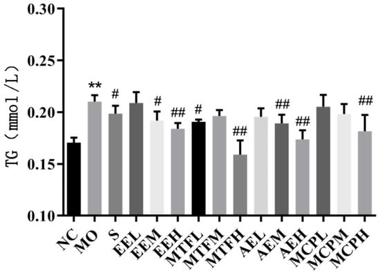 The triglyceride (TG) content of EE at moderate and high doses and the TG content of MTF at low and high doses decreased significantly after intervention (p < 0.05). The TG content of AE at moderate and high doses and the TG content of MCP at high doses significantly decreased (p < 0.05) (Figure 6).