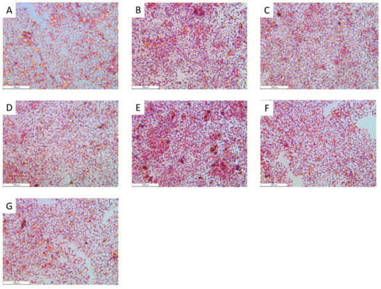 Effects of total flavonoids of MCB on fat accumulation in HepG2 cells (200×). (A) control group, (B) OA group, (C) OA + simvastatin (25 µM) group, (D) OA + MTF (200 µg/mL) group, (E) Compound C (10 µM) group, (F) simvastatin (25 µM) + Compound C (10 µM) group, (G) MTF (200 µg/mL) + Compound C (10 µM) group.