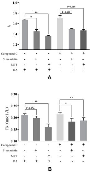 The MTF and simvastatin effectively reduced the lipid accumulation by OA (p < 0.05, p < 0.01). A similar trend was observed by Compound C intervention (p = 0.088, p = 0.056). The MTF and simvastatin significantly reduced the TG accumulation by Compound C (p < 0.05, p < 0.01) (Figure 7).