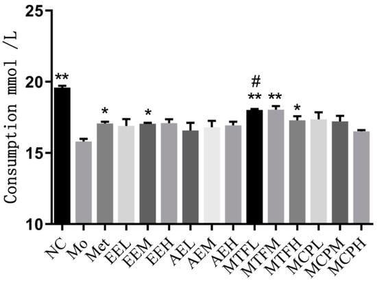 Effects of MCB extracts on glucose intake in IR-HepG2 cells. NC: control group, Mo: model group, Met: drug group, EE: ethanol extract, AE: aqueous extract, MTF: total flavonoids, MCP: crude polysaccharides. “*” and “**” represent p < 0.05 and p < 0.01 compared with the Mo group, respectively. “#” indicates p < 0.05 compared with the Met group.