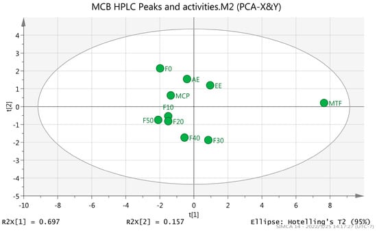 Scores of MCB extracts and fractions (OPLS−DA). EE: ethanol extract, AE: aqueous extract, MTF: total flavonoids, MCP: crude polysaccharides, macroporous resin fractional eluent: F0, F10, F20, F30, F40 and F50.