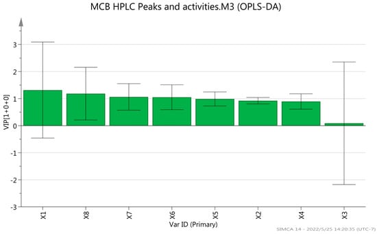 VIP of MCB extracts and fractions. X1 (Peak 1): caffeic acid, X2 (Peak 2): quercetin 3-O-galactoside, X3 (Peak 3): isoquercetin, X4 (Peak 4): astragalin, X5 (Peak 5): rosmarinic acid, X6 (Peak 6): aromadendrin-3-O-rutinoside, X7 (Peak 7): rosmarinic acid-3-O-glucoside, X8 (Peak 8): kaempferol-7-O-glucoside.