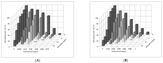 Effect of erythromycin or polymyxin B in combination with boswellic acids extract on suspension growth of (A) S. epidermidis ATCC 14990, (B) E. faecalis ATCC 29212, and (C) E. coli CCM 3954. x- and z-axes depict fractions of MIC80 of respective compound. y-axis depicts microbial growth of suspension cells in relative percentages (control represents 100%).