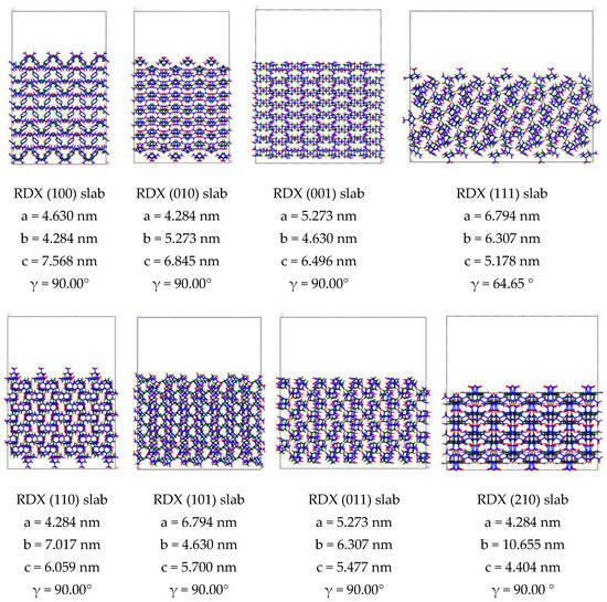 Binding energy (ΔE) between crystal surface is a measure of the inter-planar action of crystal, where a low, positive value indicates a weak interaction between the crystal surfaces. We built periodic supercell (4 × 4 × 4) bulks of RDX and HMX and cleaved different crystal surface in the bulk RDX and HMX, finally, we rebuilt periodic supercell (4 × 1 × 4) with a vacuum thickness of 20 Å. The structure of RDX and HMX slabs is shown in Figure 1. The optimization of the RDX and HMX bulks and slabs was calculated by a classical force field simulation method in the Forcite module [28] with COMPASS force field [29]. The structures were relaxed with the following thresholds for the converged structure: energy change per atom was less than 1.0 × 10−5 eV, residual force was less than 0.03 eV/Å, the displacement of atoms during the geometry optimization was less than 0.001 Å, and the residual bulk stress less than 0.05 GPa. We calculate the ΔE in a slab model according to Formula (1):