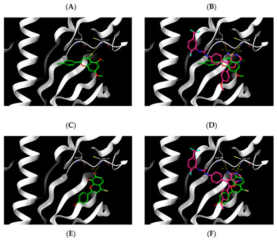 3D interaction of flavonoid derivatives (4b, 5a,b and 6a) (green) with the ATP-binding pocket of VEGFR2 and compared to co-crystallized ligand (pink). (A,B) Flavonoid 4b; (C,D) 5a; (E,F) 5b; (G,H) 6a.