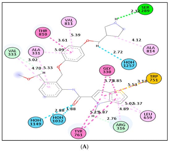 Protein interactions with the ligand can be detected throughout the simulation. These interactions can be categorized and summarized by type, as shown in the graphs below. The four types of protein–ligand interactions (or ‘contacts’) are hydrogen bonds, hydrophobic, ionic, and water bridges. The ‘Simulation Interactions Diagram’ panel in Maestro can be used to analyse the subtypes of each interaction type. Over the course of the trajectory, the stacked bar charts are standardised; for example, a value of 0.7 indicates that the specific interaction is maintained for 70% of the simulation duration. Values exceeding 1.0 are possible because some protein residues may have several interactions with the same subtype of ligand. The majority of the important ligand–protein interactions found by MD are hydrogen bonds and hydrophobic interactions, as shown in Figure 19. In terms of H-bonds, the LSD–compound 14 complex residues VAL 4288, GLY 290, TYR 571, ASP 754, and SER 760 are the most essential. Over the course of the trajectory, the stacked bar charts were standardised; for example, a value of 1.0 signifies that the specific interaction was maintained for 100% of the simulation duration. Values exceeding 1.0 are possible because some protein residues may have several interactions with the same subtype of ligand.