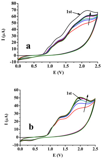 A schematic representation of the experimental procedure is shown in Figure 2 showing how the deposition was carried out on the platinum electrode. The solvents methyl isobutyl ketone and mesityl oxide had interesting effects on the electropolymerization reactions; thus, in the first part of our study, the electropolymerization reactions of the three phenylphenol isomers were explored by taking ten subsequent cyclic voltammograms between 0 and 2.5 V with a 0.1 V/s scan rate. In phenylphenols, the neighboring aromatic groups displayed electronic interactions due to the conjugation of the highly delocalized electronic system, which also affected their electrochemical polymerization reactions. When they were investigated, themselves, the differences between isomers could be estimated and a few signs regarding the polymer structures could mostly be found to be related to porosity. A light brown deposit was formed in both solvents from each of the isomers, but the layers deposited from mesityl oxide were thicker. They could easily be removed mechanically from the platinum surface, indicating weak adhesion. The CVs in methyl isobutyl ketone demonstrated deactivation of the platinum electrode in the case of the three phenylphenol isomers (Figure 3). These findings are in accordance with our earlier investigations when phenol was the substrate [14]. This process was very strong (especially remarkable) in the case of 3-phenylphenol. During the entire electropolymerization process, no tendency towards a decrease in the anodic peak currents of the monomers was observed. This was due to the swelling of the organic deposits in methyl isobutyl ketone. However, phenylphenols are bulky substrates due to the phenyl substituents, leading to more open structures of polymers, which is why swelling of their polymers was more pronounced, especially in ketone solvents.
