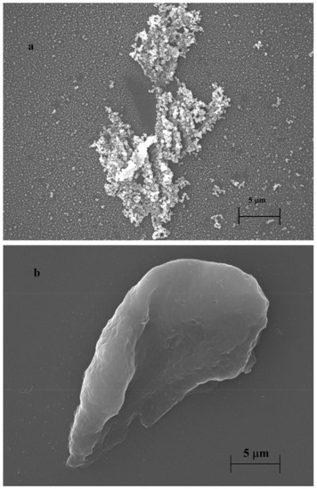 Surface images of the samples were captured with a Jeol JSM-IT500HR (Jeol, Tokyo, Japan) scanning electron microscope (SEM) using the secondary electron mode and a 30 kV acceleration voltage. The samples were coated with gold with a Jeol JFC-1300 auto fine coater (Jeol, Tokyo, Japan). The indium–tin oxide (ITO)-coated glass slides used for the microscopic experiments had an 8–12 Ω/sq surface resistance. Their surfaces were cleaned before use in an ultrasonic bath by immersion in ultrapure water to remove the physically adsorbed particles and then thoroughly washed with dry acetone.