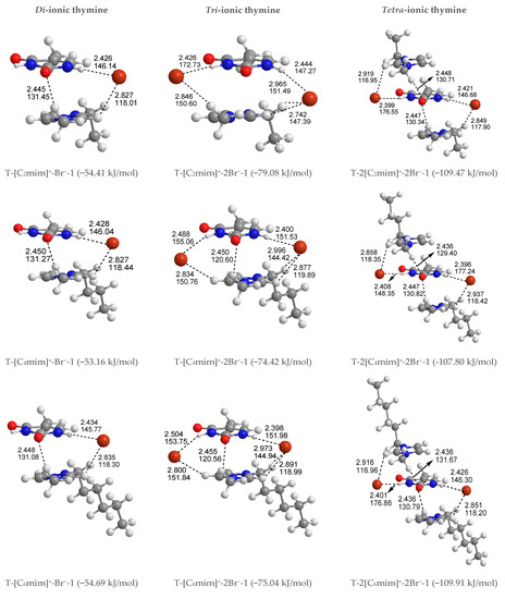 In common with the T-[Cnmim]+ system, as shown in Table S2, the second most stable configuration is a perpendicular structure (T-[Cnmim]+-Br−-5), where the Br− anion allows itself on top of the imidazolium cations and forms N1-H···Br− HB with thymine, and the [Cnmim]+ cations form double +C(2)-H···O7 and +C(6)-H···O7 HBs with thymine in an edge-to-face manner—adding an anion and leading to a greater stabilization T-[Cnmim]+-Br−-1, which are differing from T-[Cnmim]+-1 complexes in the position of the HB binding sites between the base and cations, occupying the “sugar edge” site [78] (i.e., N1-H and C2=O7 sites) of thymine. It is also the case for the less stable and coplanar geometries (T-[Cnmim]+-Br−-9), which are reminiscent of the coplanar HBs in the A-T base pair involving the “Watson-Crick” site (i.e., N3-H and C4=O8 sites) [79]. As we know from an MD simulation [42], the stabilities of A-T and G-C base pairs in the hydrated ILs are reversed under the premise that the ions do not interact with the HB-forming atoms of A-T pairwise. Compared with the absolute EB values, we have found that the superiority of T-[C6mim]+-Br−-5 in the perpendicular complexes (50.46 > 49.37 < 50.54 > 49.90 > 48.95 kJ/mol), while the slight distinctiveness of T-[C8mim]+-Br−-9 in the coplanar series (46.33 > 47.55 < 48.54 < 48.96 > 47.75 kJ/mol). From the EB vales, to T-[Cnmim]+-Br−-1, 5, 9 complexes, the stable order is stacking > perpendicular > co-planar.3.1.4. Tri-ionic T-[Cnmim]+-2Br−.