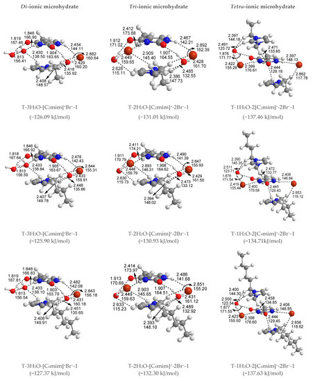 3.2.2. Ionic T-wH2O-y[Cnmim]+-xBr−-1 Microhydrates