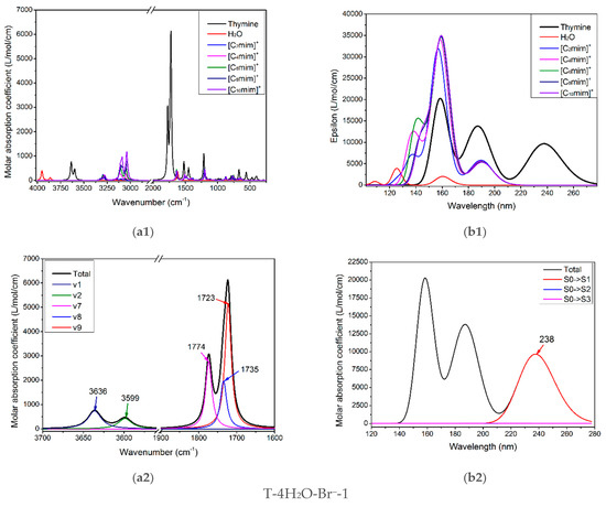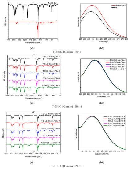 The graphical spectra for the T-4H2O-Br−-1, T-3H2O-[Cnmim]+-Br−-1, T-2H2O-[Cnmim]+-2Br−-1, and T-1H2O-2[Cnmim]+-2Br−-1 microhydrates are depicted in Figure 5(a3–a6). Additionally, in Table S7, the contributions of the primary vibrations of thymine in the hydrated species to the relevant maximum absorption peaks close to the isolated base are recorded.