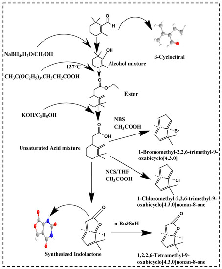 Recently, a new bioactive compound, βCC, has emerged in a variety of living organisms varying from plants and cyanobacteria to animals and fungi. It is a volatile compound consisting of a short chain of apocarotenoids produced by the non-enzymatic and enzymatic oxidation of the β-carotene. Derivatives of βCC such as lactones, β-cyclocitric acid, glycosylated βCC, 2,2,6-trimethyl-cyclohexanone and 2,6-dimethyl-cyclohexanol are briefly discussed. Lactone, being a potent biologically active compound, occurs naturally and possesses anticancer, antiplasmodial, antifungal and antimicrobial effects. Figure 1 showed the schematic synthesis of lactone. In a previous study, lactone synthesis stated by the addition of NaBH4 in the presence of H2O/CH3OH in βCC (10 g, 0.06 mol) which yielded an alcoholic compound βCC (9.65 g, yield 97%) []. This alcohol was treated with CH3C(OC2H5)3, CH3CH2COOH at 137 °C and resulted in (1,3,3-Trimethyl-2-methylene-cyclohex-1-yl) acetic acid ethyl ester. In the presence of KOH/C2H5OH, this acetic acid ethyl ester was transformed into (1,3,3-Trimethyl-2-methylene-cyclohexyl) acetic acid []. Furthermore, this acetic acid was converted to either 1-Bromomethyl-2,2,6-trimethyl-9-oxabicyclo [4.3.0] nonan-8-one with the reagent NBS/THF, CH3COOH or to 1-Chloromethyl-2,2,6-trimethyl-9-oxabicyclo [4.3.0] nonan-8-one with the help of NCS/THF, CH3COOH. It can also be converted to 1-Iodomethyl-2,2,6-trimethyl-9-oxabicyclo [4.3.0] nonan-8-one with the help of I2/KI, NaHCO3 which can be further converted to 1,2,2,6-Tetramethyl-9-oxabicyclo [4.3.0] nonan-8-one in the presence of n-Bu3SnH. The product 1,2,2,6-Tetramethyl-9-oxabicyclo [4.3.0] nonan-8-one, 1-Iodomethyl-2,2,6-trimethyl-9-oxabicyclo [4.3.0] nonan-8-one, 1-Bromomethyl-2,2,6-trimethyl-9-oxabicyclo [4.3.0] nonan-8-one and 1-Chloromethyl-2,2,6-trimethyl-9-oxabicyclo [4.3.0] nonan-8-one are all lactones derived from βCC [].