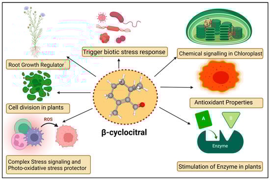 The βCC is a volatile organic compound that has been reported to have multiple functions in non-vascular plants (Figure 2). Microalgae discharge βCC, which is responsible for transferring stress signals to homogeneous algae and inducing defence. The former compound plays an allelopathic function on heterogeneous algae and aquatic macrophyte for opposite nutrients, as well as providing protection in opposition to predators []. The βCC has been reported to make cell rupture in Nitzschia palea, a diatom []. Ikawa et al. (2001) [] reported that in cyanobacterium Microcystis, βCC is one of the main emitted volatile organic compounds. Sun et al. (2020) [] suggested that the toxicity of βCC to cells might be associated with nuclear variation, DNA laddering, caspase 9- and caspase 3-like performance, signifying the initiation of a programmed cell death mechanism. In the case of cyanobacterial bloom, β-cyclocitric acid is produced by the oxidation of the βCC compound by Microcystis, indirectly causing toxicity. The production of this acidic compound leads to water acidification, causing chlorophyll loss, cell lysis, and phycocyanin pigment release, resulting in a characteristic blue colour []. These studies suggest that βCC and other volatile apocarotenoids are the principal allelopathic agents in cyanobacterial volatile organic compounds, but that at high concentrations, these compounds may be harmful to the emitters. However, no evidence has been found that low levels of βCC can elicit defence mechanisms in photosynthetic bacteria, such as those found in vascular plants. Mosses have also been observed to release volatile chemical compounds that could be used in interspecies communication []. Experimental evidence exhibited that photosynthetic activators and enzymatic variance treated with βCC in plants increased the photosynthetic rate, root-shoot expansion and carbon assimilation [].