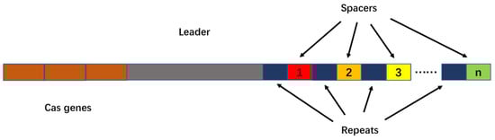 The CRISPR/Cas system is an adaptive immune defense system first discovered in Escherichia coli and used by bacteria and archaea as a defense against virus invasion. CRISPRs refers to clustered regularly interspaced short palindromic repeats, which was first described by Jansen et al. in a study of bacterial and archaeal genome sequences []. Its structure is shown in Figure 1.