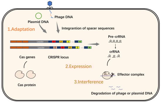 CRISPR sequences consist of repeat sequences and spacer sequences. Repeat sequences are repeating palindromic sequences arranged one after the other, separated by spacer sequences, while the DNA of the spacer sequences is not identical. Research has found that spacer sequences match viral DNA, especially phage DNA [,,]. The upstream gene located at the CRISPR/Cas locus is named CRISPR-associated gene, or Cas gene for short. The Cas gene is closely linked to the CRISPRs site, and the Cas protein expressed thereby plays a key role in the realization of the CRISPR/Cas system function. Cas proteins have helicase and nuclease activities that can cut DNA strands; based on these findings, scientists have proposed the theory that the CRISPR/Cas system defends against virus invasion through three stages of adaptation, expression and interference (Figure 2) [,,,].