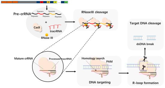 Cas9, as an endonuclease, contains two central HNH and RuvC that exert endonuclease activity. Jinek et al. found that Cas9 has a strong ability to cleave DNA under the mediation of tracrRNA and crRNA []. When the CRISPR/Cas system works, tracrRNA forms double-stranded RNA with pre-crRNA through complementary base pairing and assembles into a complex with the protein encoded by cas9. The spacer sequence is then cleaved under the action of RNase III, and finally a crRNA containing a spacer sequence RNA and a partial repeat sequence is formed. This complex binds to the target DNA under the guidance of crRNA, and then the two endonuclease active sites of Cas9 cut the DNA double-strand, in which the HNH site cuts one strand complementary to the crRNA, and RuvC cuts the other strand (Figure 3).