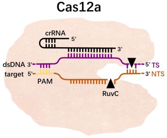 CRISPR/Cas12a is a member of the Class II CRISPR/Cas system []. The CRISPR/Cas12a system contains the Cas12a protein and a shorter CRISPR RNA (crRNA). Unlike Cas9, Cas12a does not require the assistance of RNA or other proteins in the process of processing pre-crRNA into mature crRNA, nor does it require RNase III []. Therefore, Cas12a can achieve the cleavage of the target without tracrRNA. Cas12a identifies double-stranded DNA (dsDNA) via a single crRNA, thereby inducing staggered DNA breaks on the non-targeting and targeting strands via the RuvC and Nuc endonuclease domains, respectively []. Cas12a recognizes the double-stranded DNA of T (thymine)-rich PAM under the guidance of crRNA, and then unzips the double-stranded DNA. After melting, the target strand in the double-stranded DNA is complementary to the crRNA, causing a conformational change, exposing the RuvC site, which cuts the non-target strand (NTS) in the double-stranded DNA, and then cuts the TS; this is referred to as the cis-cleavage activity of Cas12a. After cleavage, the Cas12a-crRNA complex remains bound to the target dsDNA, the NTS is trimmed and the cleavage product is released after cleavage, which leaves the still active RuvC site exposed and able to bind to ssDNA and exert trans-cleavage activity (Figure 4). Therefore, the specificity of Cas12a can be guaranteed by designing crRNA complementary to the target sequence. Then, combined with fluorescent probes or immunochromatography technology, nucleic acid detection can be achieved.