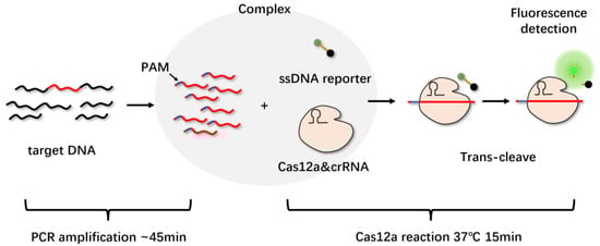 In addition to the combination of PCR technology, the introduction of isothermal nucleic acid amplification technology eliminates the dependence on high-end temperature control equipment, allowing for the detection method to be used beyond the laboratory and making it possible to implement on-site. Combining Cas12a single-stranded DNase activation with isothermal amplification, Chen et al. developed a method called DNA endonuclease-targeted CRISPR trans reporter (DETECTR); this method can identify HPV16 and 18 types in patient samples within one hour, and the method achieves the attomolar sensitivity of DNA detection []. Li et al. applied recombinase-mediated isothermal nucleic acid amplification to this system and established a simple and high-sensitivity detection platform for Listeria monocytogenes, with the detection limit reaching 26 cfu/mL []. Zhang et al. also combined recombinase polymerase amplification (RPA) technology with CRISPR/Cas12a to detect SARS-CoV-2 [].