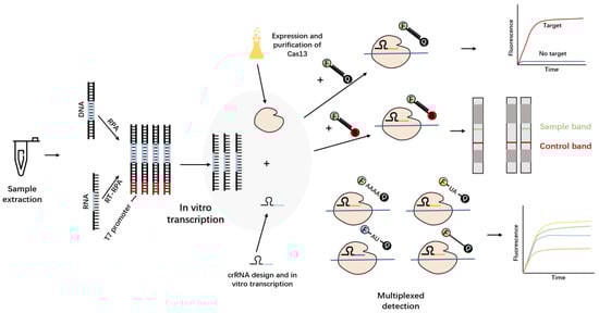 - Ackerman, C.M.; Myhrvold, C.; Thakku, S.G.; Freije, C.A.; Metsky, H.C.; Yang, D.K.; Ye, S.H.; Boehm, C.K.; Kosoko-Thoroddsen, T.-S.F.; Kehe, J.; et al. Massively multiplexed nucleic acid detection with Cas13. Nature 2020, 582, 277–282. [Google Scholar] [CrossRef] [PubMed]