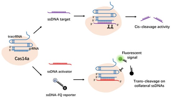 Cas14 is a new DNA-targeting CRISPRs effector protein identified by Doudna et al. in the archaea “DPANN” phylum []. Cas14a, like Cas12a, is from the Type V family of the Class 2 system. Cas14a is the smallest Class 2 CRISPRs effector demonstrated to date, containing approximately 400–700 amino acids, half of the Cas9 protein (950–1400 amino acids). Akin to Cas12a, Cas14a also possesses RNA-guided ssDNA-targeting endonuclease activity (Figure 7). The Cas14a protein does not need to recognize the PAM site in the DNA sequence. By combining the non-specific single-stranded DNase activity of the Cas14 protein with isothermal amplification technology, it may be used for high-fidelity DNA single-nucleotide polymorphism genotyping and ssDNA virus detection [].