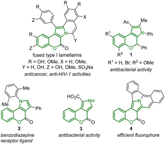 The chromenopyrrole moiety is present in a wide range of natural and synthetic compounds with a number of important useful properties [,,,,,,,,,,,,,,]. Thus, chromeno[3,4-b]pyrrole scaffold is the basis of the skeleton of type I lamellarin alkaloids isolated from marine mollusks, tunicates and sponges [,] (Figure 1). Some of them have shown anticancer activity [,], including against multidrug-resistant cancer cell lines [], as well as anti-HIV-1 activity at noncytotoxic concentration []. Synthetic chromeno[3,4-b]pyrrole derivatives 1 exhibited antibacterial activity against Staphylococcus aureus and Escherichia coli comparable to that of gentamicin []. Significant pharmacological activity was also found in chromeno[4,3-b]- and chromeno[3,4-c]pyrrole derivatives. For example, 1,3-diaryl-substituted pyrrolo[3,2-c]coumarin 2 is a benzodiazepine receptor ligand [], while pyrrolo[3,4-c]coumarin-1-carboxylic acid 3 has shown high antibacterial activity against Gram-positive and Gram-negative bacteria [] (Figure 1). Pericyclic pyrrolo[3,4-c]coumarin 4 emits blue light and may be tested as blue-light emitters with an electron-transporting ability [] (Figure 1). In view of the above, the development of methods for the synthesis of these classes of compounds is being carried out by various scientific groups, and the search for new effective approaches to the design of chromenopyrrole scaffolds continues [,,,,].