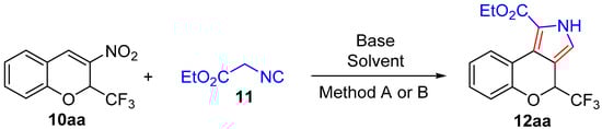 In order to obtain chromeno[3,4-c]pyrroles 12, we optimized conditions for the reaction of 2-trifluoromethyl-substituted chromene 10aa with ethyl isocyanoacetate 11 to form chromeno[3,4-c]pyrrole 12aa (Scheme 2, Table 1).