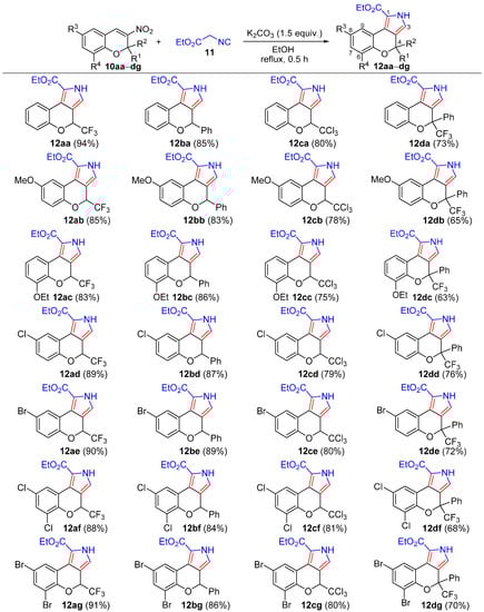 The substituents at the 2-position of chromene 10 had a notable effect on the yields of the products 12 (Scheme 3). The highest yields (83–94%) were observed in the reactions of isonitrile 11 with 2-trifluoromethyl- and 2-phenyl-substituted chromenes 10aa–ag and 10ba–bg. The yields of 2-trichloromethyl-substituted pyrroles 12ca–cg decreased by 7–14% compared to 2-trifluoromethyl-substituted analogs 12aa–ag. Lower yields in the reactions involving chromenes 12ca–cg were probably associated with the formation of 2-(dichloromethylidene)chromenes as a result of the elimination of HCl under the action of the base. We have already observed a similar process earlier in the reactions of these chromenes with sodium azide []. The introduction of a second substituent at the 2-position of chromenes 10aa–ag or 10ba–bg (Ph or CF3 group, respectively) reduced the yields of products 12da–dg to 63–76% due to additional steric hindrances for attacking the double bond by the reagent. At the same time, the yields of pyrroles 12 were almost independent from the donor–acceptor properties of substituents R3 and R4. Replacement of the hydrogen atoms at the positions 6 and 8 of the starting chromenes 10 with the donor MeO or EtO groups only slightly reduced the yields of compounds 12.