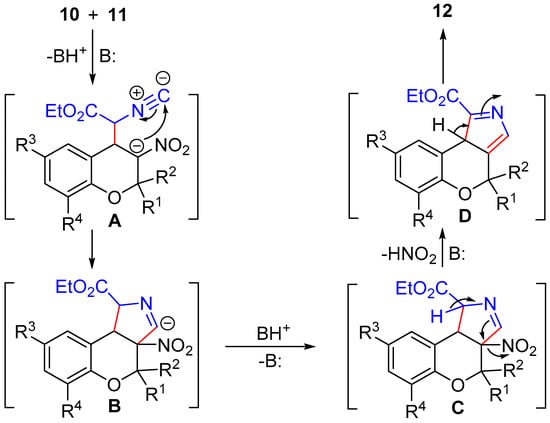 The probable reaction mechanism includes the Michael addition of isonitrile 11 to chromene 10, intramolecular cyclization of the nitronate anion A into pyrroline B, protonation of anion B, elimination of nitrous acid in pyrroline C, and 1,3-H shift in 3H-pyrrole D to form chromeno[3,4-c]pyrrole 12 (Scheme 5) [].