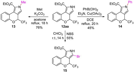 To assess the possibility of using pyrroles 12 in organic synthesis, some transformations of the pyrrole ring were carried out (Scheme 6). It was found that chromenopyrrole 12aa was methylated at the nitrogen atom to form the N-methyl derivative 13 in 76% yield. Treatment of compound 12aa with phenylboronic acid by the Chan–Evans–Lahm coupling reaction led to the corresponding N-phenylpyrrole 14 in 45% yield. 3-Bromo derivative 15 was obtained in 55% yield by bromination of compound 15 with N-bromosuccinimide.