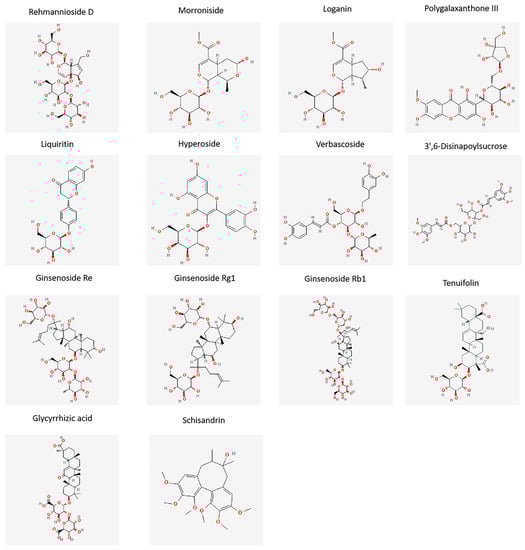 The following supporting information can be downloaded at: https://www.mdpi.com/article/10.3390/molecules27238611/s1, Figure S1: Results of method specificity examination. Rehmannioside D (A), Morroniside (B), Loganin (C), Polygalaxanthone III (D), Liquiritin (E), Hyperoside (F), Verbascoside (G), 3′,6-Disinapoylsucrose (H), Ginsenoside Re (I), Ginsenoside Rg1 (J), Ginsenoside Rb1 (K), Tenuifolin (L), Glycyrrhizic acid (M), Schisandrin (N); Table S1: Information of standard products.