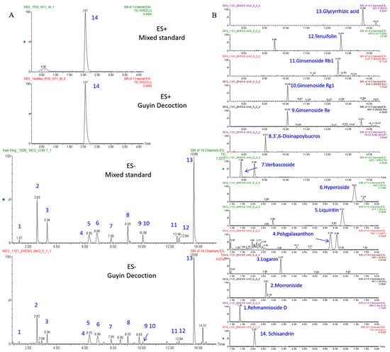 Representative chromatogram. (A) Total Ions Chromatograph (TIC) of the mixed standards compared with the GYJ samples. (B) Chromatograms of individual extracts of each compound in GYJ samples.