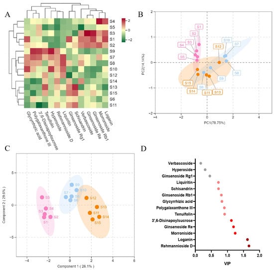 Results of cluster analysis and multivariate statistical analysis for the content determination of 14 analytes of fifteen batches (S1–S15) of GYJ samples. (A) Heat map of cluster analysis; (B) Results of PCA analysis; (C) Results of OPLS-DA analysis; (D) VIP Score Graph.
