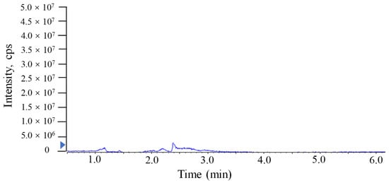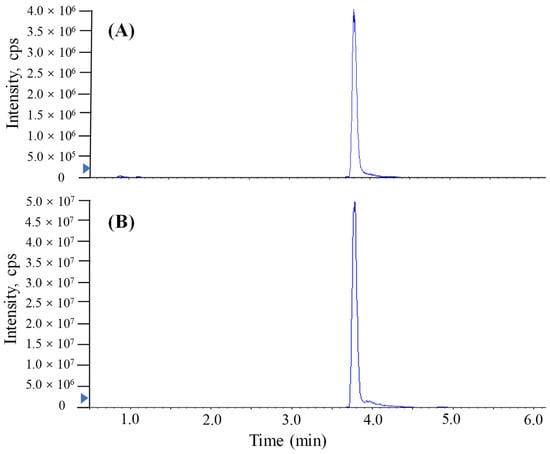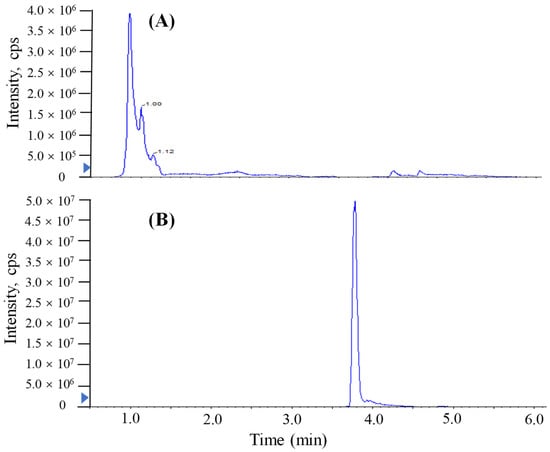 The LC conditions related to the chromatographic column, the mobile-phase composition and the modifier were optimized after the MS/MS conditions. The TTX standard solutions (20 ng/mL) were applied to carry out the optimization of the LC parameters. In the present study, ACQUITY BEH C18 (100 × 2.1 mm, 1.7 μm, Waters), and ACQUITY UPLC BEH Amide (100 × 2.1 mm, 1.7 μm, Waters) employed in previous reports [,], were investigated for the separation of TTX, which are the octadecylsilane stationary phase and amide stationary phase, respectively. Mobile phase A and B consisted of 0.1% formic acid and 1 mmol/L ammonium formate in water and acetonitrile, respectively. The mobile-phase elution gradient and flow rate were optimized to obtain a good chromatographic separation effect. It could be found that the ACQUITY UPLC BEH Amide column and a flow rate of 0.3 mL/min with the following gradient had a sufficient separation effect: 0–0.5 min, 90% B; 0.5–2 min, from 90% to 50% B; 2–3.5 min, 50% B; 3.5–4 min, 50% to 90% B; 4–9 min, 90% B. However, the ACQUITY BEH C18 column with the following gradient did not have a reasonable separation effect: 0–2 min, 80% A; 2–5 min, from 80% to 5% A; 5–8 min, 5% A; 8–9 min, 5% to 80% A; 9–10 min, 80%. The auto-sampler temperature and column temperature were finally set to 4 °C and 40 °C, respectively. The separation chromatogram with ACQUITY UPLC BEH Amide of TTX is shown in Figure 2.