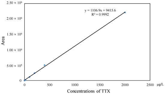 When puffer fish food poisoning occurs, a positive result for poisoning is normally determined based on the patient’s symptoms and the detection of TTX in residual food. Recently, numerous methods for TTX analysis have been published. Several drawbacks should be mentioned. Bioassays are complicated by problems of inaccuracy associated with the determination of death, difficulty of mouse management that hampers emergency responses and animal welfare issues []. On the other hand, physicochemical methods with instruments, such as those using high-performance liquid chromatography (HPLC) with a fluorescence detector and gas chromatography–mass spectrometry (GC-MS), have been reported, but these methods are limited by their complicated operation due to the requirement of degradation by strong alkali and trimethylsilyl derivatization [,]. Reports using LC-MS/MS are also emerging, as this instrument has become common. However, the detection limit of LC-MS/MS has always been deemed to be not adequate for the quantitative analysis of real samples with trace levels of TTX due to suppression by matrix effects. Therefore, it is of great significance to develop the present method to achieve the analysis of TTX with high sensitivity and selectivity [,].