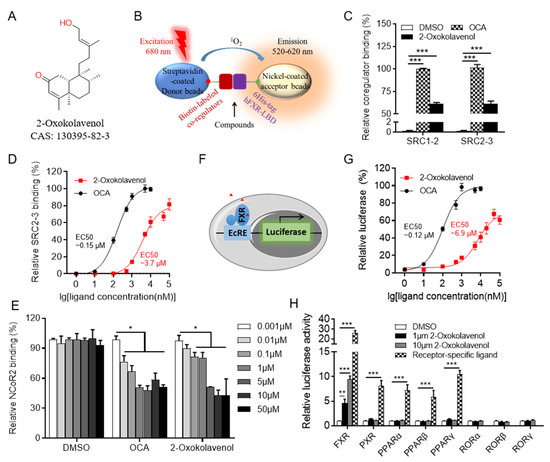 Identification of natural product 2-oxokolavenol as a novel FXR agonist. (A) Chemical structure of 2-oxokolavenol. (B) Diagram of the AlphaScreen assay for determining whether the tested compounds can induce FXR to recruit co-regulators. Biotin-labeled co-regulators bound to the streptavidin-coated donor beads, 6His-tagged FXR-LBD bound to the nickel-coated acceptor beads. (C) SRC1-2 and SRC2-3 coactivator motifs bound to FXR-LBD in response to 2-oxokolavenol or OCA in the AlphaScreen assay. (D) Dose response curves of 2-oxokolavenol or OCA in inducing FXR-LBD to recruit the SRC2-3 binding motif in the AlphaScreen assay. (E) NCoR2 corepressor motif bound to FXR-LBD in response to gradient 2-oxokolavenol or OCA in the AlphaScreen assay. (F) Diagram of cell-based luciferase reporter assay. FXR can bind to the ecdysone response element (EcRE) and initiate the transcription of downstream genes. Cloning the luciferase gene downstream of EcRE to gain the reporter assay. (G) Dose response curves of 2-oxokolavenol or OCA in inducing FXR transcriptional activity in the dual-luciferase reporter assay. (H) Selective transcriptional activity of FXR by 2-oxokolavenol based on dual-luciferase reporter assay. Plasmids encoding indicated full-length nuclear receptors and their cognate response reporters were co-transfected into HEK293T (from ATCC). Six hours later, cells were treated with DMSO, 2-oxokolavenol (1 μM and 10 μM), or receptor-specific agonist: FXR, 1 μM OCA; pregnane X receptor (PXR), 10 μM rifampicin; peroxisome proliferator-activated receptor alpha (PPARα), 1 μM GW590735; PPARβ, 1 μM GW0742; PPARγ, 1 μM rosiglitazone. * p < 0.05, ** p < 0.01, *** p < 0.001. Values represent the means ± SEM of three independent experiments.