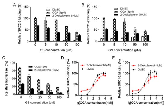 Guggulsterone E&Z (GS) was the first reported small molecule with antagonistic activity against FXR []. In the AlphaScreen assay, 2-oxokolavenol potently induced FXR to recruit coactivators SRC2-3 and SRC1-2, both of which could be intercepted by gradient GS treatment (Figure 2A,B). In the cell-based dual-luciferase reporter assay, gradient GS also consistently inhibited the FXR transcriptional activity induced by 2-oxokolavenol (Figure 2C). OCA is a full FXR agonist with a strong ability to activate FXR, whereas 2-oxokolavenol had slightly lower activity against FXR compared to OCA. Thus, if 2-oxokolavenol bound to the same FXR ligand binding pocket as OCA, the presence of 2-oxokolavenol would inevitably intervene in the coactivator recruitment curve of FXR in response to OCA. Indeed, coactivator SRC (1-2 and 2-3) recruitment of FXR in response to OCA was more sensitive at low OCA concentrations in the AlphaScreen assay since there were sufficient FXR molecules for both OCA and FA binding, thus exerting positive collaborative effects in activating FXR. However, SRC (1-2 and 2-3) recruitment was less sensitive at high OCA concentrations since OCA and 2-oxokolavenol competed for binding to insufficient FXR molecules (Figure 2D,E). Given that 2-oxokolavenol could compete with both FXR antagonist GS and FXR agonist OCA to bind with FXR, these data reaffirmed that natural product 2-oxokolavenol acts as a novel FXR modulator.