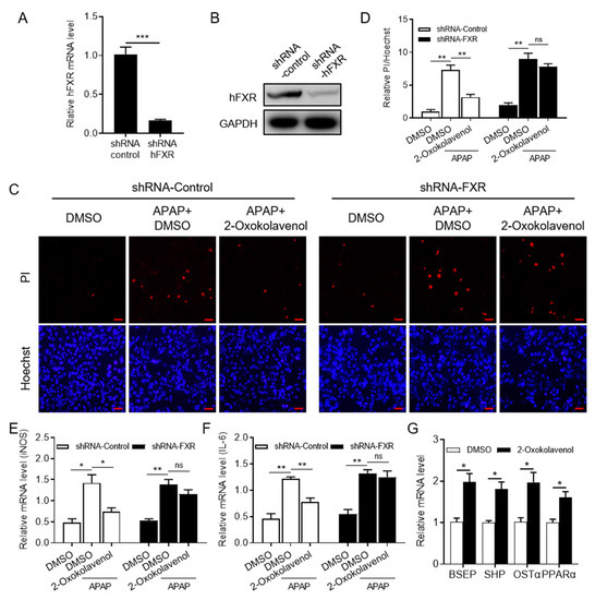 2-Oxokolavenol alleviated APAP-induced hepatocyte damage in a partial FXR-dependent manner. Human liver WRL68 cell line (from ATCC) with silenced FXR (shRNA-FXR WRL68) was established with lentivirus technology, and scrambled shRNA was used as control (shRNA-control RWRL68). (A,B) The efficacy of FXR silencing in shRNA-FXR WRL68 cells was identified by measuring FXR mRNA (A) and protein (B) levels. (C) The shRNA-control and shRNA-FXR WRL68 cells were treated with APAP for 6 h after pre-treatment with 2-oxokolavenol or DMSO for 18 h, then Hoechst33342 and propidium iodide (PI) stains were used. Hoechest33342 can stain all cells, but PI will only stain damaged cells due to inadequate membrane permeability. (D) Relative quantification of PI/Hoechst33342-positive cell ratios in fluorescent images from (C). (E) Relative iNOS mRNA levels. (F) Relative IL-6 mRNA levels. (G) Relative mRNA levels of FXR target genes in WRL68 cells. p values were determined by one-way ANOVA with Tukey’s multiple comparison post hoc test, ns, no significance, * p < 0.05, ** p < 0.01, *** p < 0.001. Values represent the means ± SEM of three independent experiments.