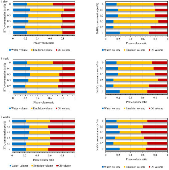 Emulsification is mostly the prevalent mechanism in surfactant oil recovery processes. Therefore, the emulsifying power of the surfactants–alkali combination and emulsion stability were also studied. The emulsification test involved homogenizing 3 wt% NaCl brine and crude oil using the surfactants at different concentrations as the emulsifying agent. The aqueous solution and crude oil were mixed at a 1:1 ratio in a 25-mL test tube. Homogenization was achieved using T18 digital ULTRA-TURRAX. The homogenized systems were left to equilibrate and observed over time while they disintegrated into their original component at 80 °C. The period of observation was one month, and the percentage reduction in the emulsion phase volume was used to analyze the stability of the emulsions formed. The percentage reduction in the emulsion phase volume is given by:
