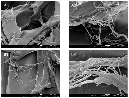 Field emission scanning electron microscopy images (FESEM) of lizardfish skin collagens extracted with different acids. (A1) acetic acid-extracted collagen at 500× magnification; (A2) acetic acid-extracted collagen at 10,000× magnification; (B1) lactic acid-extracted collagen at 500× magnification; (B2) lactic acid-extracted collagen at 10,000× magnification; (C1) citric acid-extracted collagen at 500× magnification; (C2) citric acid-extracted collagen at 10,000× magnification.