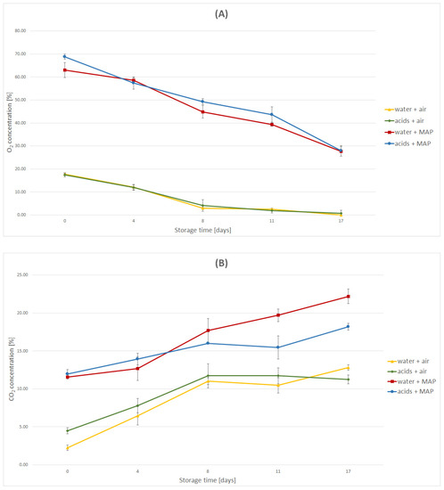 Natural respiration processes occur in plant tissue, and an increase in the population of microorganisms resulted in the reduction in oxygen content in all variants subjected to rinsing and packaging. In the variants “water + air” and “acids + air”, the greatest reduction in the oxygen content occurred during the first seven days of storing the carrots. On the eleventh day, anaerobic conditions were observed in both variants. In the variants “water + MAP” and “acids + MAP”, the oxygen content decreased evenly over the assumed storage time. Due to the high initial oxygen concentration in the packaging surrounding the carrots, the oxygen was not completely consumed throughout the storage period of the samples. On the seventeenth day, in both variants packed in a modified atmosphere, the oxygen concentration was equal to 27% (Figure 1A). In all packaging variants the carbon dioxide content showed an increasing tendency. In the samples packed in air, the concentration of carbon dioxide increased until the 8th day of the process, after which its value stabilized at the level of 10%. The results obtained for the rinsing variants “water + MAP” and “acids + MAP” indicate a significant impact of the use of an acid solution for rinsing the plant raw material on the reduction in the carbon dioxide content increase in the package. The concentration of carbon dioxide increased in both variants, however, from the eleventh day of storing carrots, a decrease in the upward trend in the variant “acids + MAP” was observed. More importantly, the concentration of carbon dioxide in the “water + MAP” variant exceeded 20%. This level of carbon dioxide is considered potentially toxic to carrots (Figure 1B).