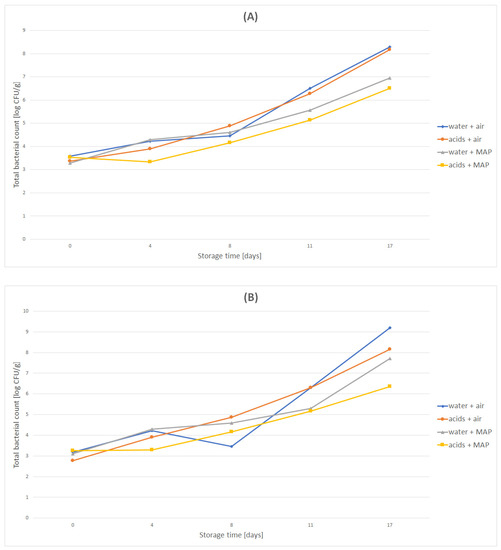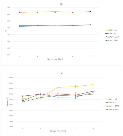 As shown in Figure 2D, the number of Pseudomonas determined in the tested carrots increased in all variants except for the “water + MAP” variant. In this variant, the presence of Pseudomonas bacteria was not detected on the fourth day, however this most likely was a technical issue. On the eighth day, an increase in the number of Pseudomonas bacteria by four orders of magnitude was noted in this variant. In all tested carrot variants, the increase in the number of Pseudomonas bacteria was relatively uniform from day eight onward, but it should be noted that in the last 24 h of the experiment the value of this microbiological indicator in the “water + MAP” variant was similar to the variants of air packed carrot. In the case of the “acids + MAP” variant, the number of Pseudomonas bacteria on the final day of the experiment was the lowest among all the examined microbiological indicators and amounted to 6.42 log CFU/g.