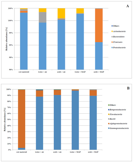 The analysis with the use of the MiSeq Illumina platform showed that the Proteobacteria phylum dominated in all variants of the tested carrots (Figure 3A). In the case of raw carrots, five main classes were identified, among which the Alphaproteobacteria bacteria were predominant, while the Gammaproteobacteria class, which is the main field of interest in this work, was dominant in the minimally processed carrots (Figure 3B). Using the Illumina MiSeq technology, the authors determined the metapopulation profile of fresh carrots, and then carrots which were rinsed with disinfecting solutions. Sequencing of the 16s region of the rRNA allowed the authors to determine that Proteobacteria and Firmicutes were the dominant phyla in fresh carrots. The dominant class was Gammaproteobacteria, but the authors also identified the presence of the Bacilli, Betaproteobacteria and Alphaproteobacteria classes in the trials.