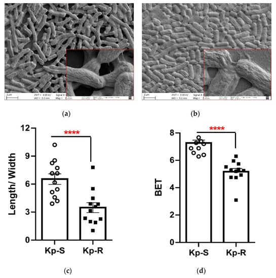 The selected Kp-R and Kp-S cultures (5 mL each) grew to the mid-log phase with an OD 600 of 0.8. The bacterial cells from each culture were washed with potassium-phosphate buffer (50 mM, pH 7.0), and two droplets of heparin sodium were added. Bacterial cells were then fixed by immersion in 3% glutaraldehyde in potassium-phosphate buffer overnight at 4 °C. Following two washes with buffer, the specimens were dehydrated with ethanol (v/v) ranging from 10% to 90% and stored in 100% ethanol. For SEM, the specimens were dried to a critical point, coated with gold, and observed under a scanning electron microscope (SU5000; Hitachi, Tokyo, Japan). Cellular widths and lengths were measured with Image J. BET was calculated by the formula (2πr2 + 2πrh)/πr2h [52].