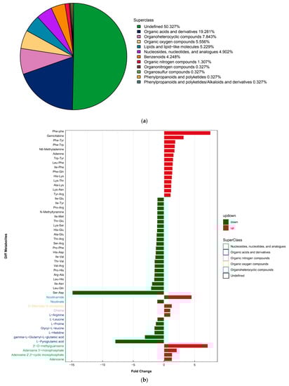 Unbiased metabolomic profiling of extracellular secretions showed differences of the two strains, as illustrated by a pie chart (Figure 4a). A total of 306 metabolites were identified by liquid chromatography–tandem mass spectrometry (LC–MS/MS) (p < 0.05) (Table S2). After normalizing to total peak intensity, the processed data were subjected to a multivariate analysis of orthogonal partial least-squares discriminant analysis (PLS-DA) for negative or positive ion labels between the two strains (Figures S2 and S3). When analyzing the differences in metabolite expression in positive-ion mode, 93 metabolites significantly increased and 94 decreased (p < 0.05) (Figure 4b, Table S3); whereas 89 metabolites significantly increased and 91 decreased in negative-ion mode (Figure 4c, Table S4). When KEGG enrichment analysis (Kyoto Encyclopedia of Genes and Genomes, http://www.kegg.jp/ accessed on 17 September 2020) was applied, 16 predominant molecular species were found produced by Kp-R, including inosine, adenine, adenosine, adenosine 2′, 3′-cyclic monophosphate, adenosine 3′, 5′-cyclic phosphate (cAMP), adenosine 3′-monophosphate, choline, citrate, d-mannose, d-Ribulose 5-phosphate, glycerol 3-phosphate, inosine, l-Arginine, l-Histidine, l-Leucine, l-Proline and N2-Acetyl-l-ornithine.
